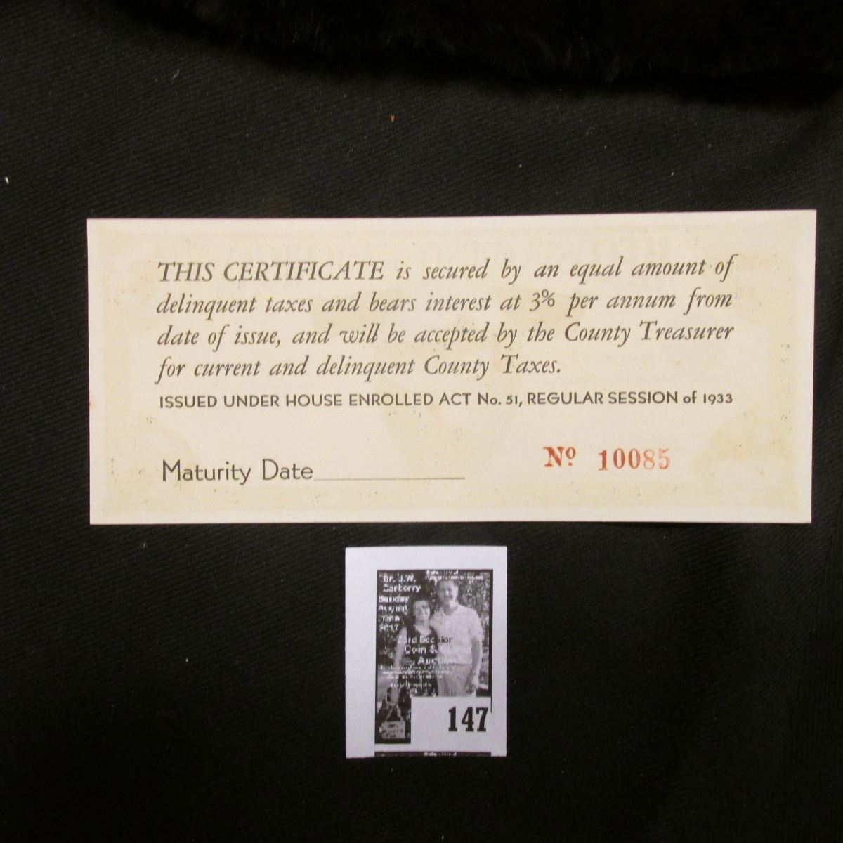 Absentee bidders will receive an invoice detailing their successful bid and shipping charges. Payment must be made within five days of receipt of notification and lots will be mailed after payment in full has been made.