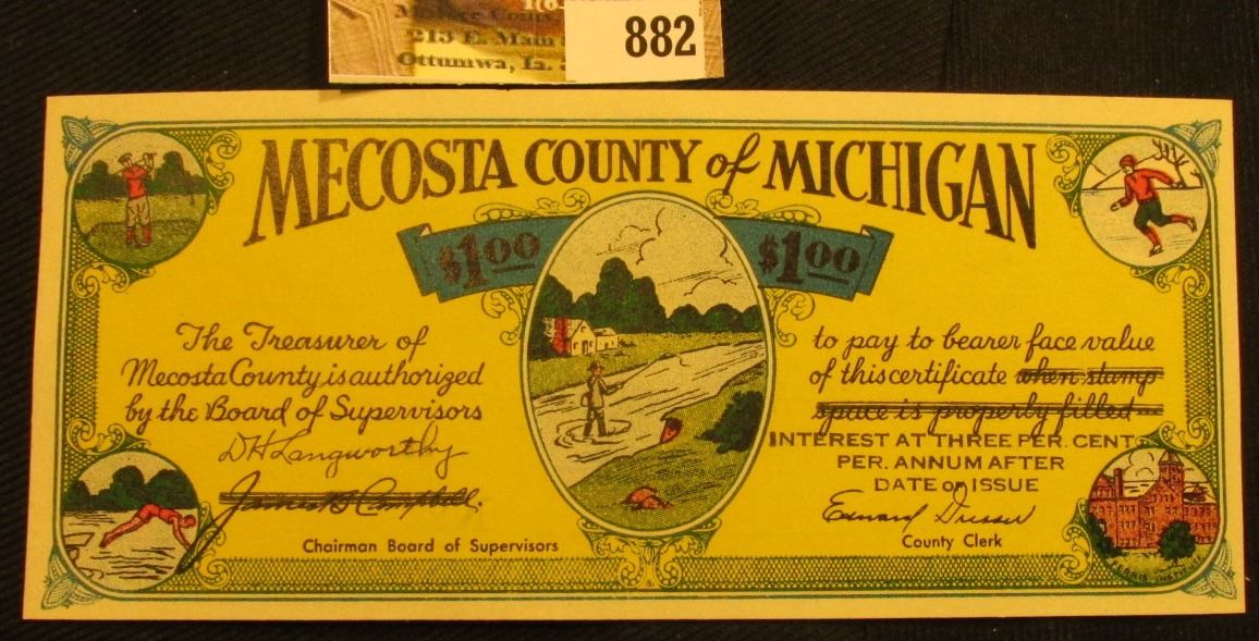 Depression Scrip "Issued under House Enrolled Act. No. 51, Regular Session of 1933" $1.00 "Mecosta County of Michigan", Type 2 variety. CU.