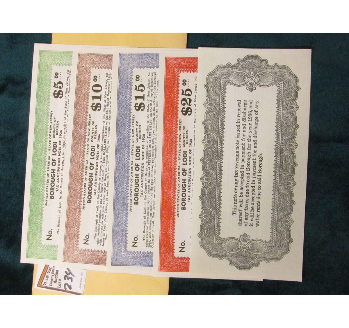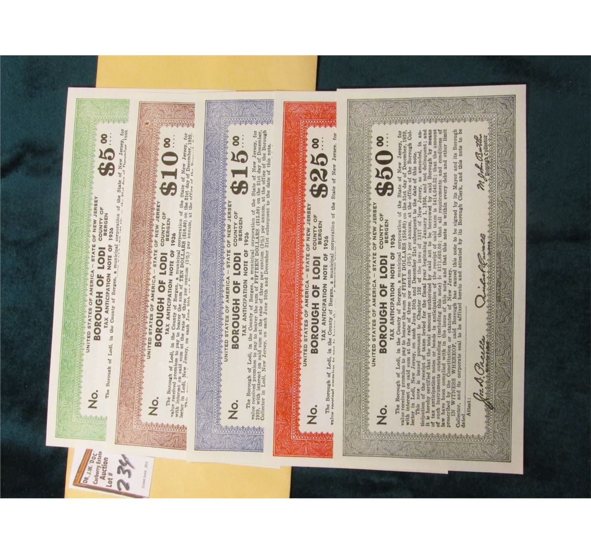 Depression Scrip, all Mint condition: $5, $10, $15, $25, & $50 Borough of Lodi-Tax Anticipation Note