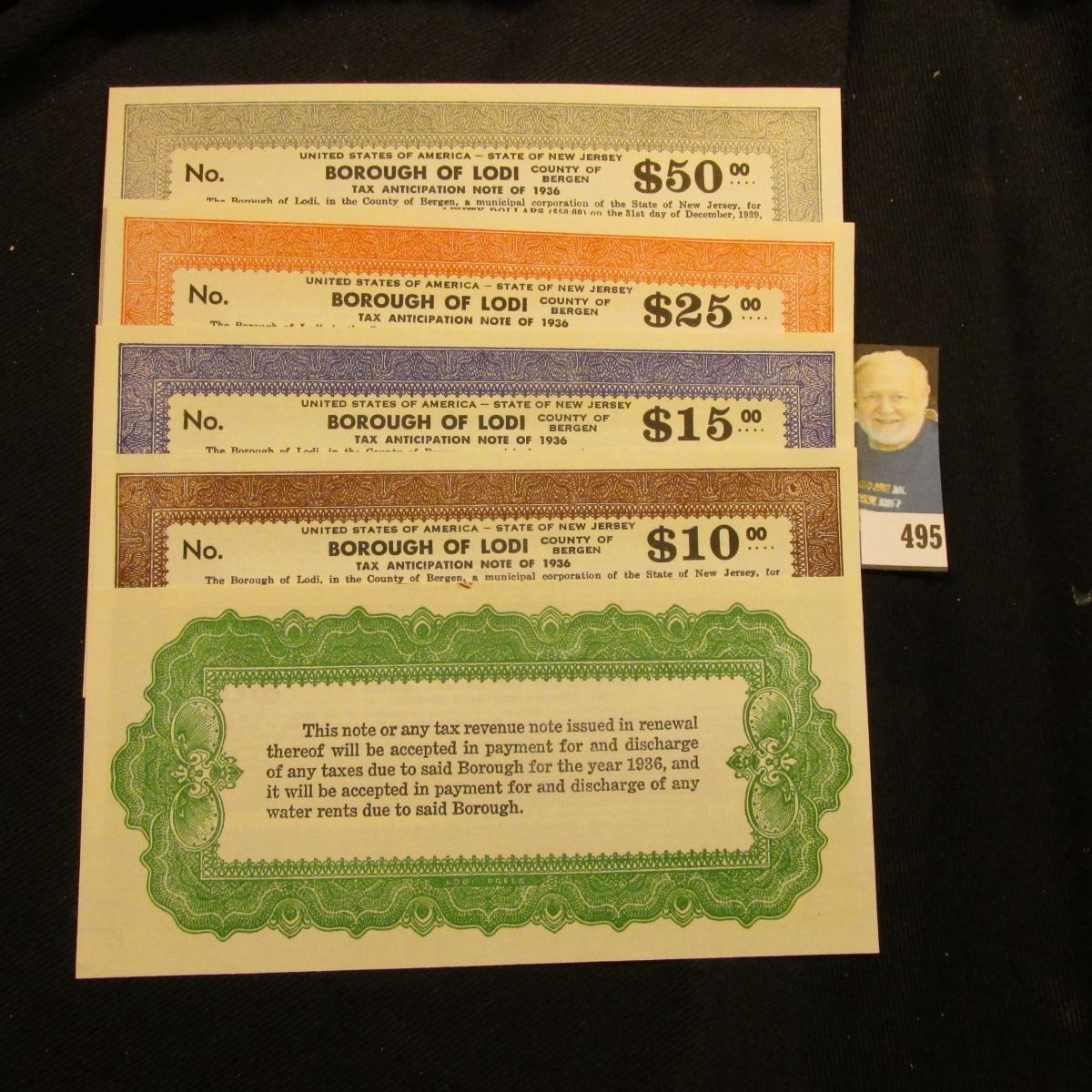 Depression Scrip, all Mint condition: $5, $10, $15, $25, & $50 Borough of Lodi-Tax Anticipation Notes of 1936, New Jersey. Catalog # NJ550-5, 10, 15, 25, & 50. 1984 Krause Catalog Value was $25.00.