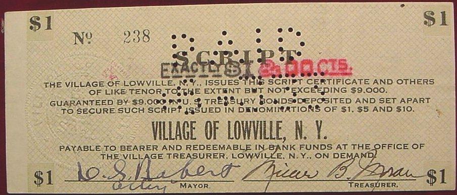 Depression Script, $1. Lowville N.Y. Hole Punch Paid.