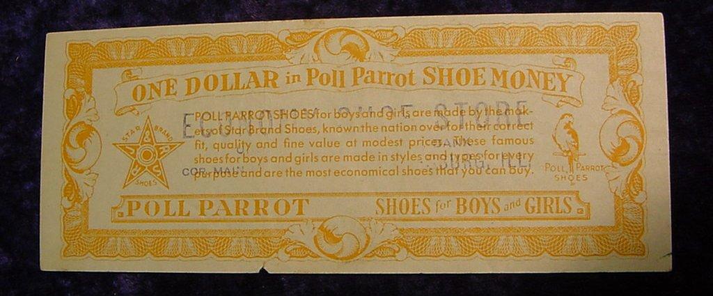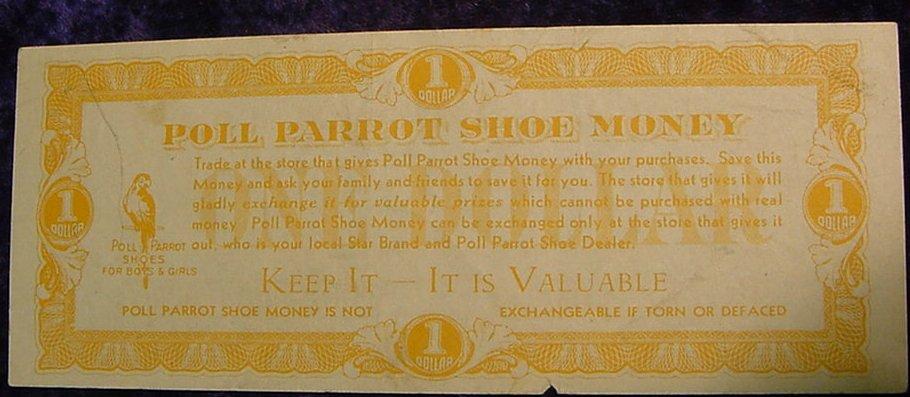 Depression Script 1930's $1. Poll Parrot Shoe Money" Galesburg Illinois.