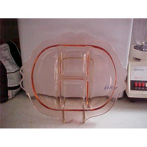 Depression glass pink relish divided 4 ways, etched four sides; heavy glass; 9.75 X11.75