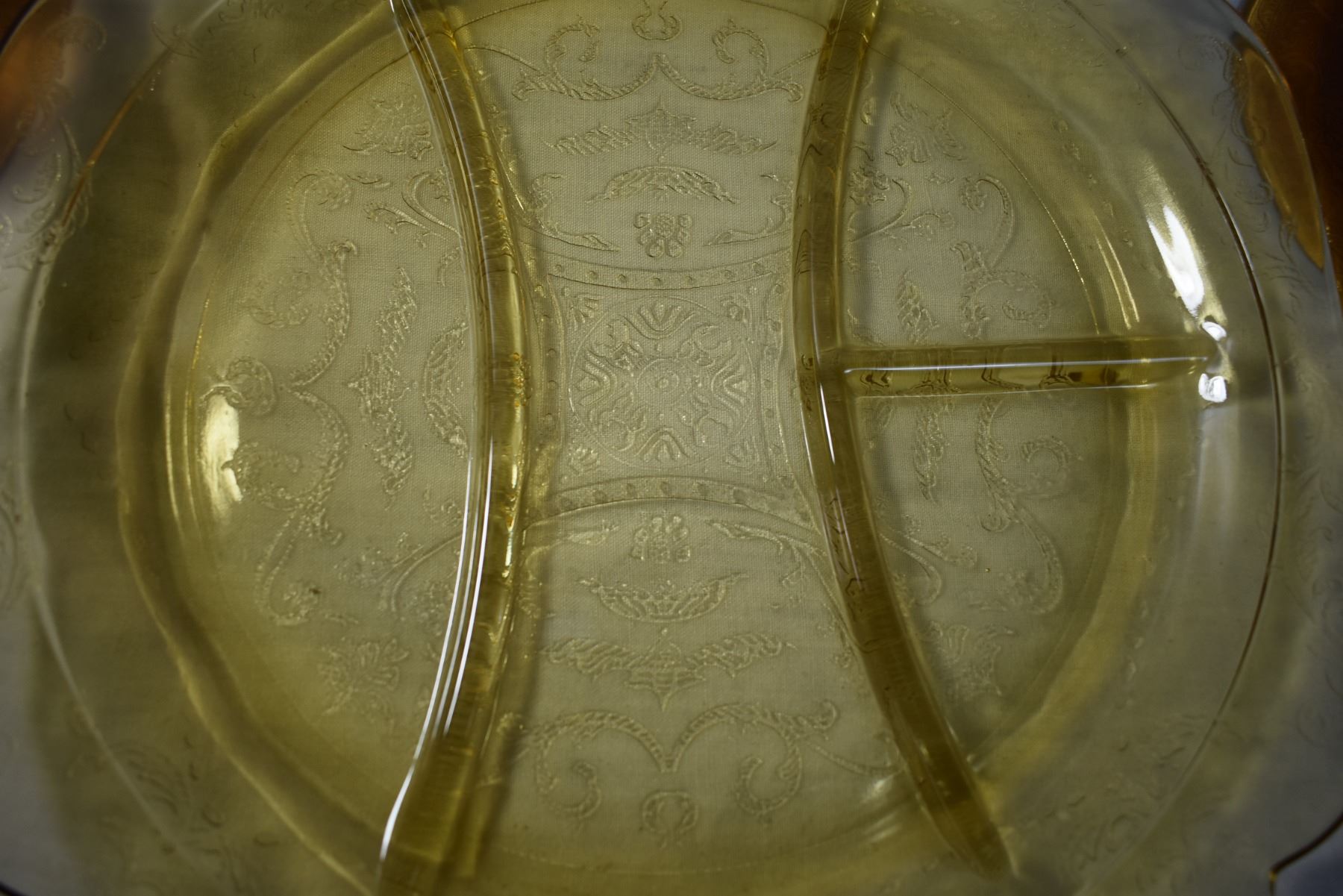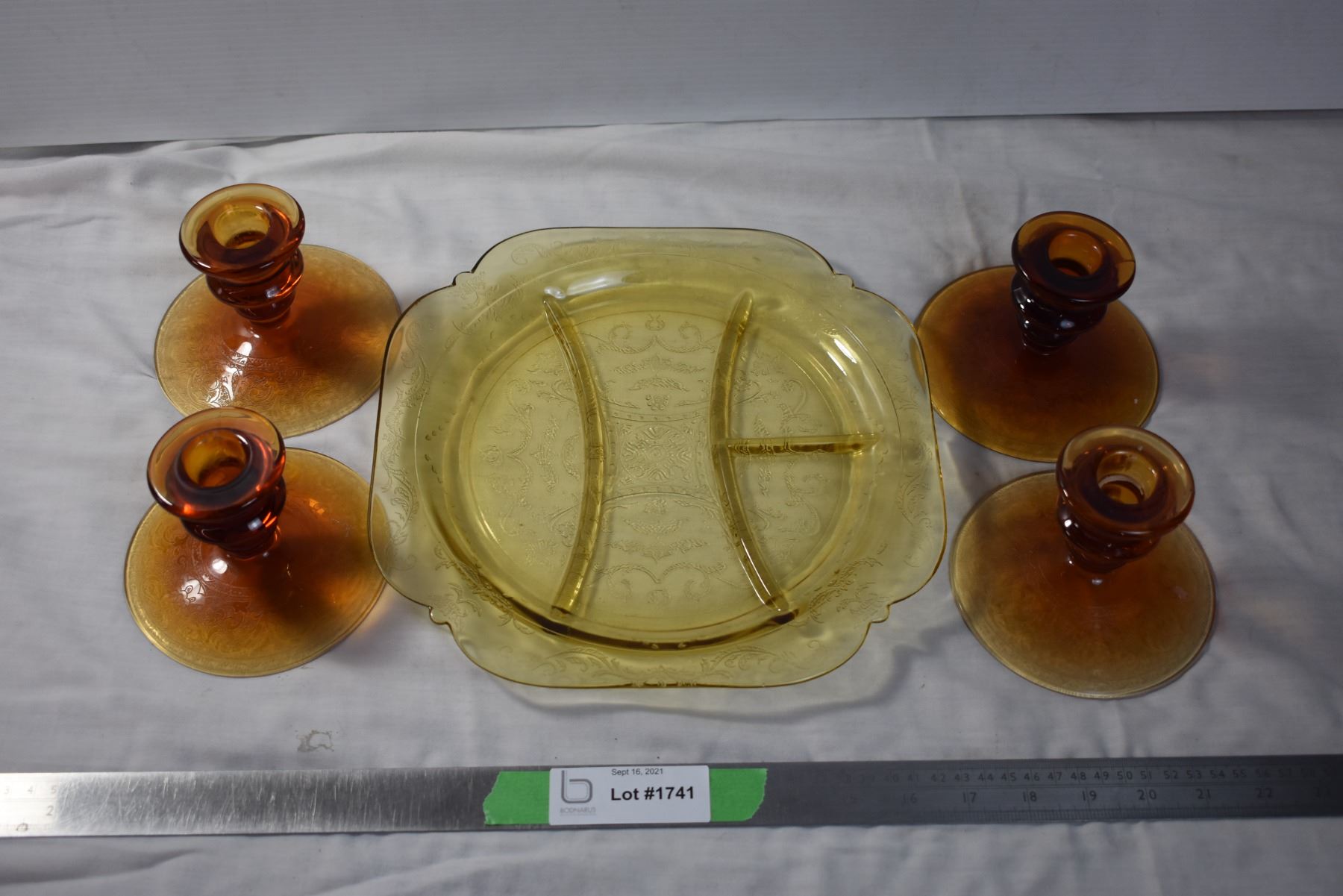Depression glass plate with set of 4 glass candlesticks
