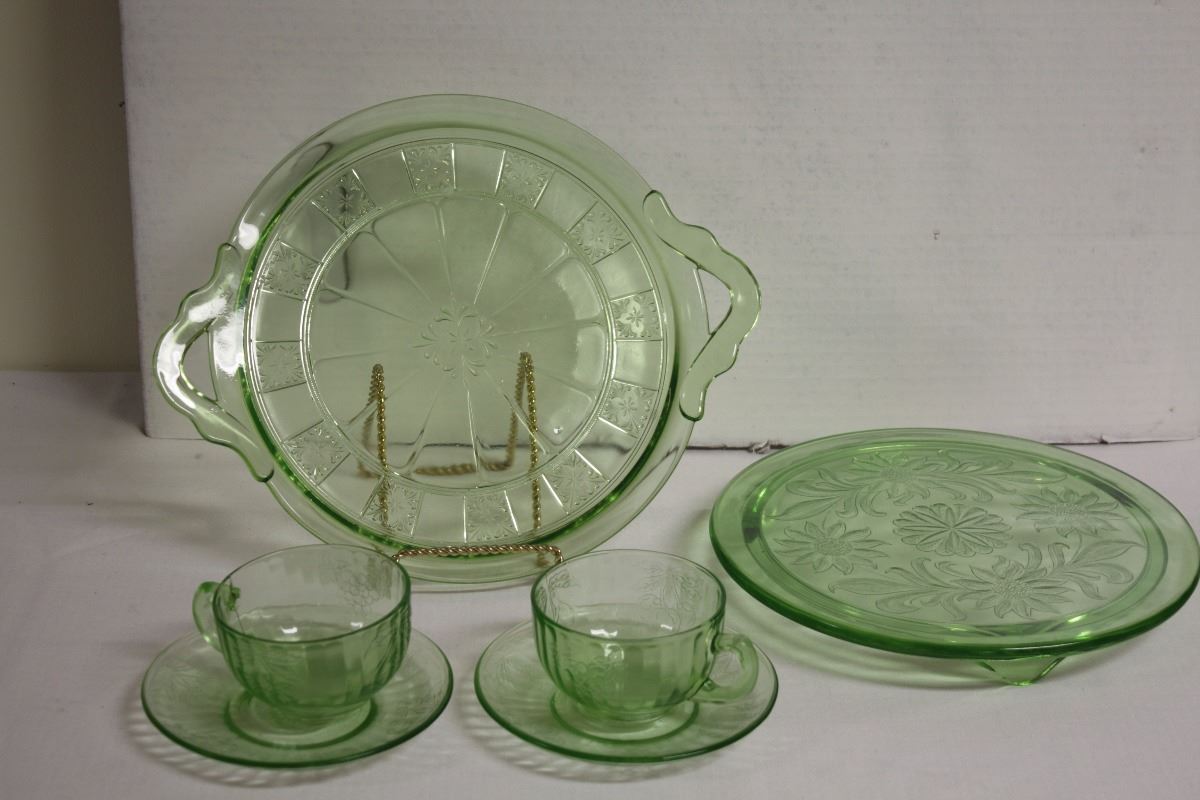 An assortment of green depression glass. Two platters, and two cups with saucers
