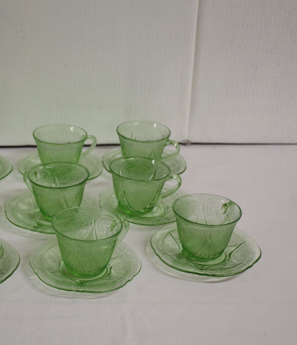 A set of 6 green royal lace cups and saucers made of depression glass