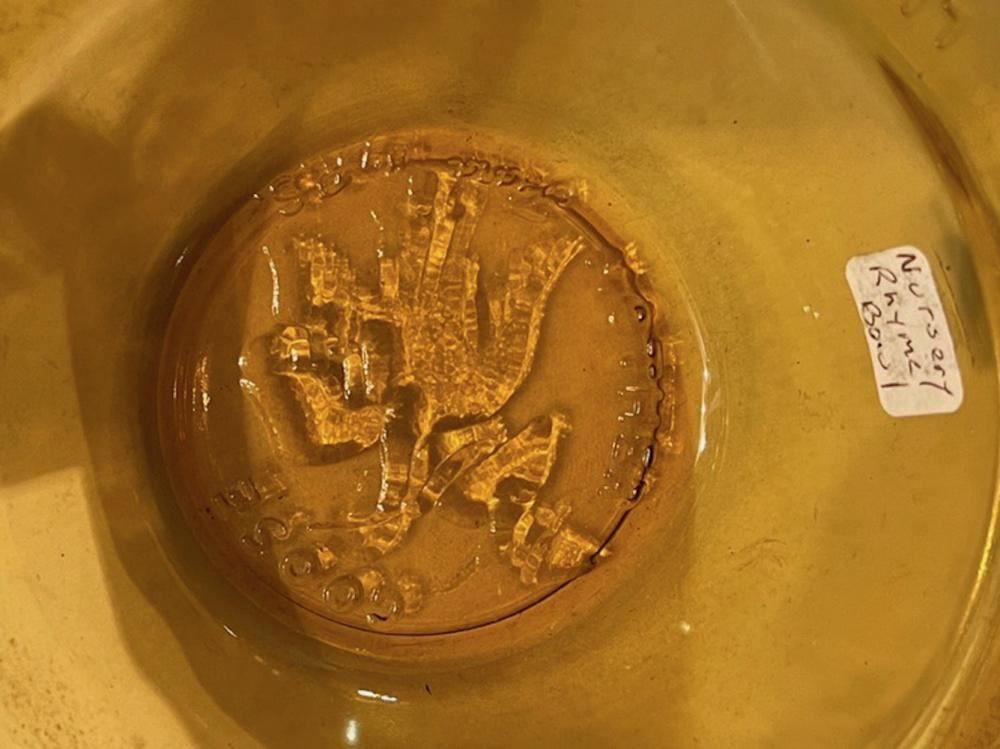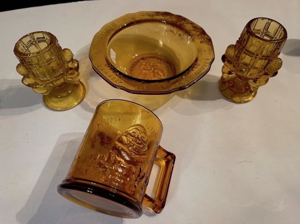 Amberglass Depressionware, nursery set including Humpty Dumpty mug.