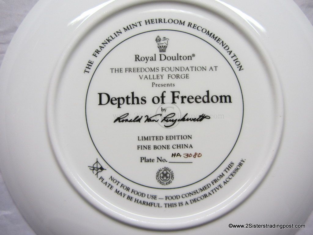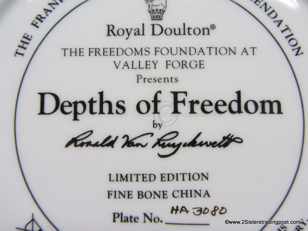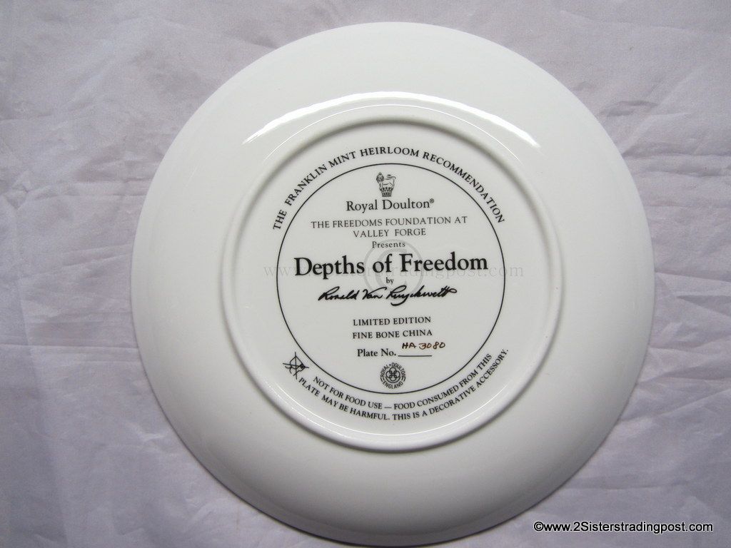 Royal Doulton® The Freedoms Foundation at Valley Forge, art work by Ronald Van Ruyckevelt "Depths of Freedom". This is one of seven plates available in the series, all plates are in beautiful condition made available by The Franklin Mint Heirloom Recommendation Plate #HA3080 NOTE: small white spot above eagles beak (see image #2)
