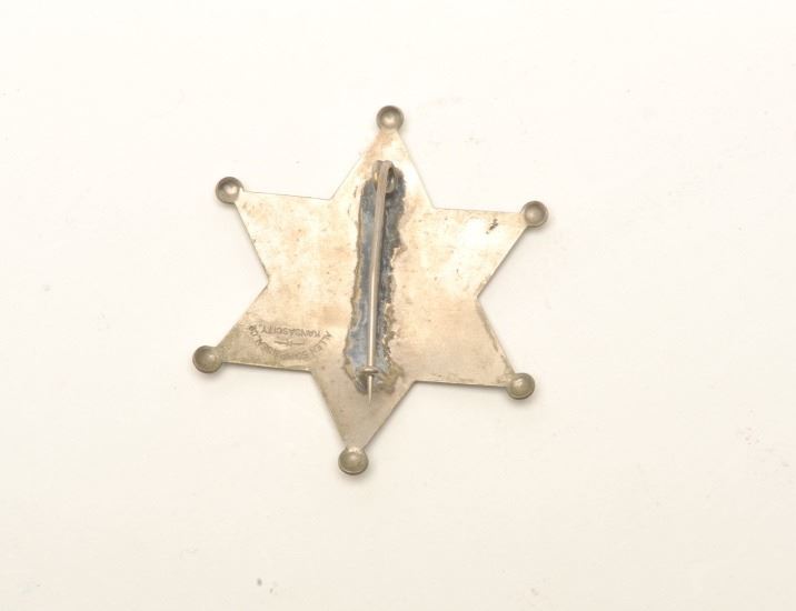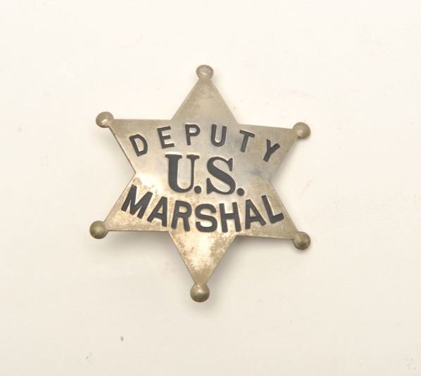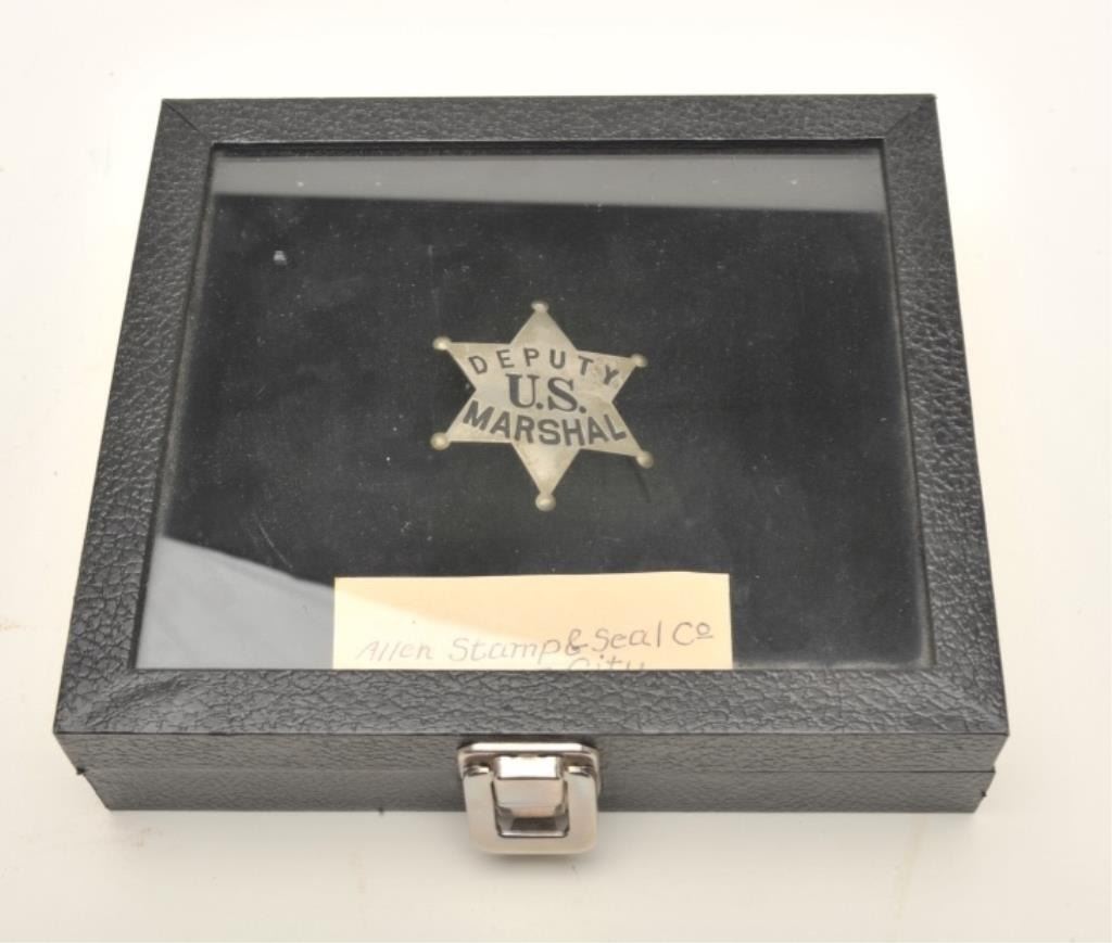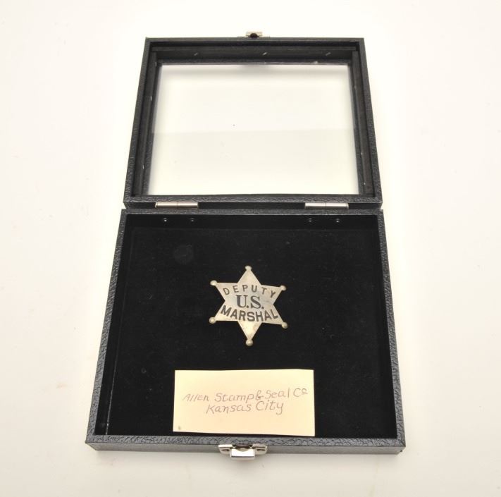 Deputy U.S. Marshal 6-pointed badge; marked on reverse “ALLEN STAMP & SEAL CO./KANSAS CITY”; un-cleaned nice patina; in riker display case. Est.: $150-$300.