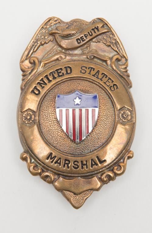 Deputy U.S. Marshal shield style badge, enamel center piece, spread eagle at top, no maker marks on reverse. Est.: $150-$300