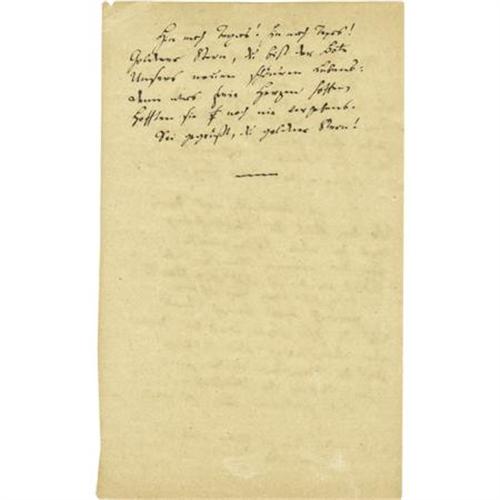 <B>"Der Stern von Texas" A.H. Hoffman von Fallersleben Autograph Poem</B></I> (not signed), 1.5 pages, 4.25" x 6.75", front and verso. In German. In 1843, German poet A.H. Hoffman von Fallersleben befriended writer Gustav Dresel who had recently returned from Texas. Hoffman encouraged Dresel to have his Texas journal published and volunteered to do the editing. In late 1845, a few weeks before a friend, Adolf Fuchs, and his family sailed for Texas, Hoffman wrote a poem for their departure, "Der Stern von Texas" ("The Star of Texas"). In 1846, he published a collection of 31 songs, <I>Texanische Lieder</B></I>. Even though it was published in Germany, Hoffman's title page said it was written by German Texans and published in San Felipe, Texas, by Adolf Fuchs & Co., in order to circumvent German censorship regulations. Offered here are all four stanzas, completely handwritten by Hoffman. The first stanza, loosely translated: "<I>After Texas, after Texas. Where the star in the blue field announces a new world, each heart for right and liberty and for truth gladly ignites - |there my heart longs itself completely.</B></I>" August Heinrich Hoffmann von Fallersleben is better known as the author of the German anthem, "Das Deutschlandlied" which begins "Deutschland, Deutschland uber alles..." Evenly toned and near fine.<BR><BR><b>Shipping:</b> Flat Material, Small (<a target="_blank" href="http://www.heritageauctions.com/common/shipping.php">view shipping information</a>)