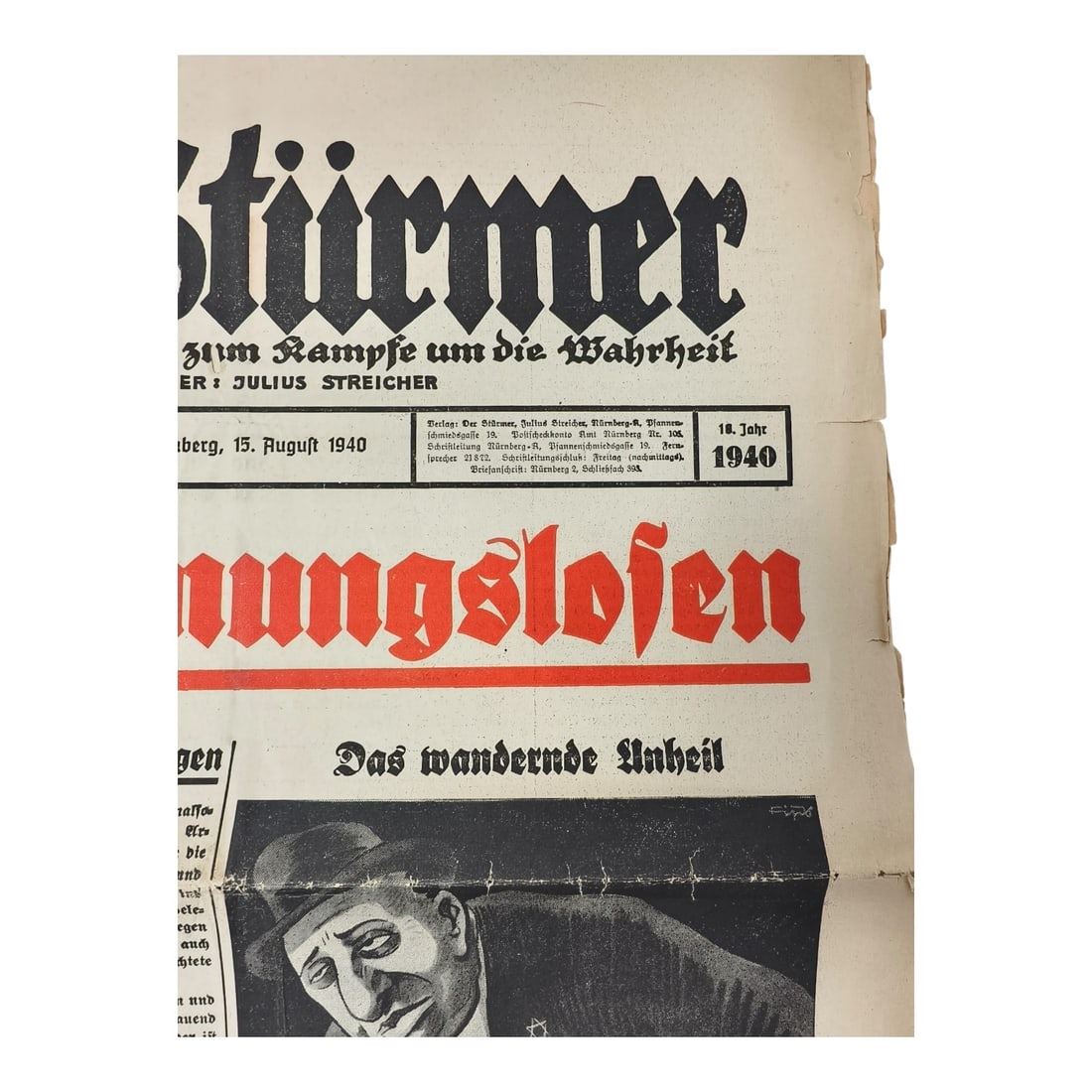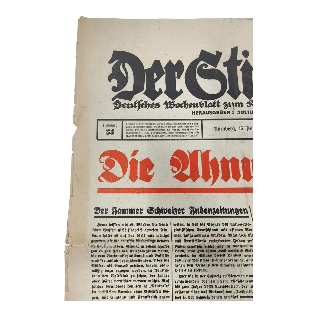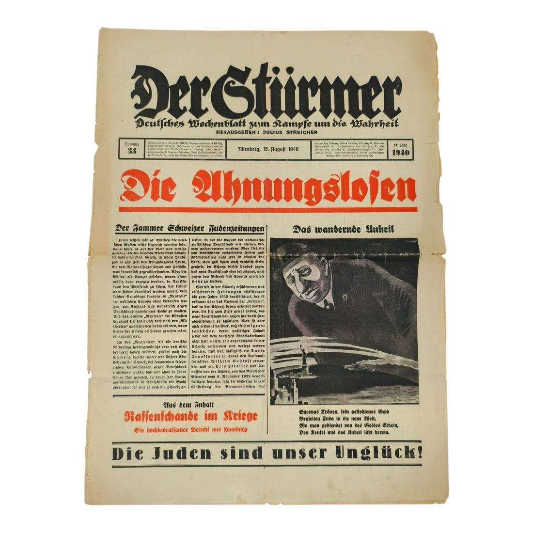 Der Sturmer Newspaper Issue 1940 Number 33. This is an original issue of the Nazi propaganda newspaper Der Stürmer — one of the most infamous antisemitic publications of the Third Reich, edited and published by Julius Streicher in Nuremberg.