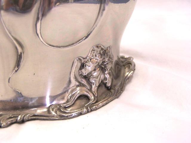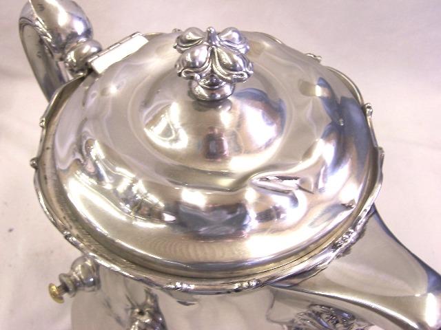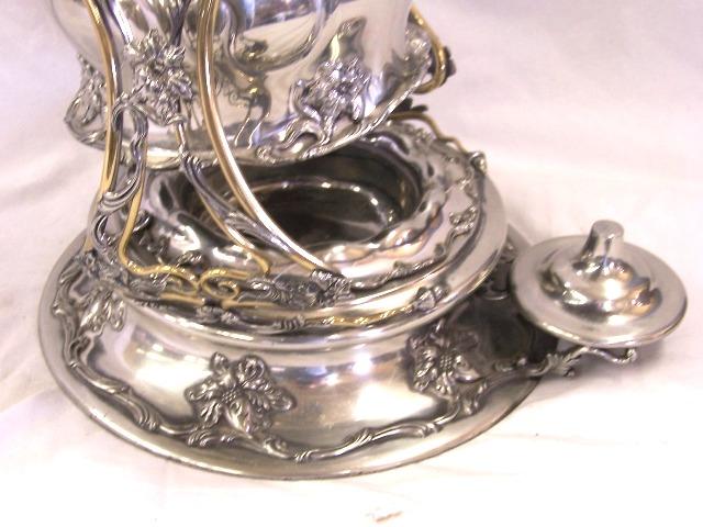 English art nouveau tea kettle on stand by Derby Silver Co. Ca 1885-90. Quadplate with heavily detailed in a art nouveau floral décor throughout, removable bottom liner. Approx 13" pot size, approx 23" stand size and 13" wide. Condition is good with some normal use and wear to handle and other areas. Some minor dent to top of pot as shown in photos. 13lbs Total
