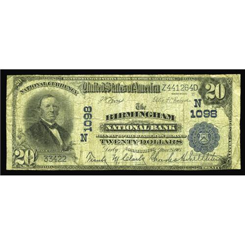 <B>Derby, CT</B></I> - $20 1902 Plain Back Fr. 650 <B>The Birmingham NB</B></I> Ch. # (N)1098<BR>The signatures are quite dark on this well circulated second title example with no holes visible. <B>Very Good.</B></I>