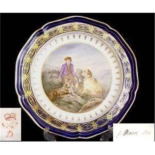<p> Painteed beneath a gilt and cobalt border is a young man and three long haired hounds in a Highland setting.