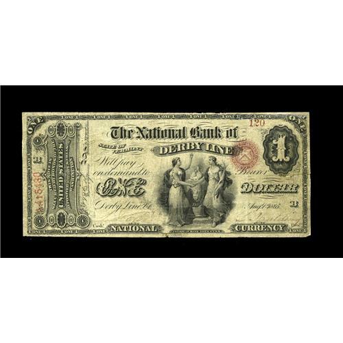 <B>Derby Line, VT</B></I> - $1 Original Fr. 380 <B>The NB of Derby Line</B></I> Ch. # 1368<BR>This is a scarce northern Vermont bank where two aces make up the entire roster of early notes, as everything else in the census from this bank is Third Charters and small size. This is the higher grade of the two aces, although a repair at the top and a closed split must be mentioned as well. <B>Fine.</B></I>