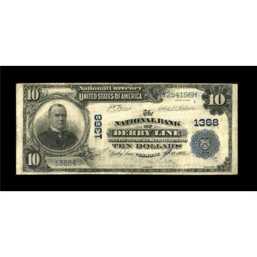 <B>Derby Line, VT</B></I> - $10 1902 Plain Back Fr. 624 <B>The NB of Derby Line</B></I> Ch. # 1368<BR> This piece is solid, though the surfaces are a bit soft. <B>Very Good.</B></I><BR><I>From The Kansas City Collection.</B></I><BR><BR><b>Shipping:</b> Coins & Currency (<a target="_blank" href="http://www.heritageauctions.com/common/shipping.php">view shipping information</a>)