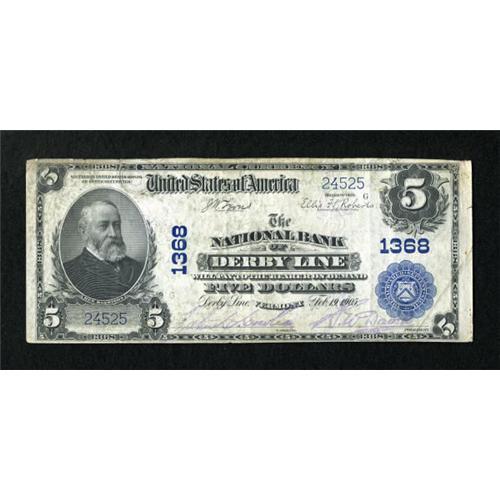 <B>Derby Line, VT</B></I> - $5 1902 Plain Back Fr. 598 <B>The NB of Derby Line</B></I> Ch. # 1368<BR> A small damaged area is noticed at upper left on this otherwise <B>Very Fine </B></I>example.<BR><BR><b>Shipping:</b> Coins & Currency (<a target="_blank" href="http://www.heritageauctions.com/common/shipping.php">view shipping information</a>)