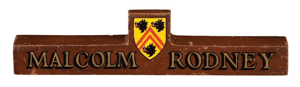 (TCF, 1966) Desk name plaque of Derek Flint’s nemesis, “Malcolm Rodney,” played by Edward Mulhare in the hilarious James Bond spoof, Our Man Flint, starring James Coburn. Hand-painted with Rodney’s family crest. TCF numbers handwritten on the bottom.