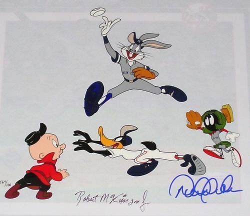 Each cel in this very special limited edition of 100 is hand-signed by future Hall of Famer Derek Jeter and Robert McKimson, Jr., son of famous Warner Bros. animator Robert McKimson, Sr.: Special second edition of 100 signed by Jeter and McKimson with a blue pen (Sharpie or similar) Dimensions: 16 × 20 Excellent condition Certificate of Authenticity This exciting hand-painted cel is published by Authentic Images and Authorized by Warner Bros., Major-league baseball Properties and the Major League Baseball Players Association.