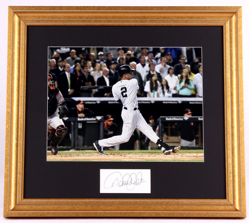 Custom framed photo display measures 19" x 21" in size. Features a 2" x 4" cut that has been hand-signed in black ink pen by Derek Jeter. The autograph includes an official PSA/DNA hologram and matching LOA for authenticity purposes.