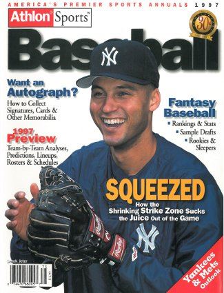 This is an Athlon Sports 1997 MLB Baseball Magazine with New York Yankees Superstar Derek Jeter on the cover. This Preview has team analysis, predictions, lineups and more for the 1997 Season