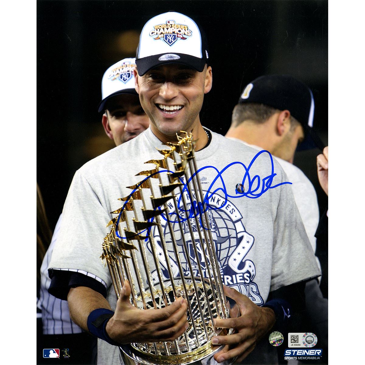 Derek Jeter with 2009 World Series Trophy 8x10 Photo (Signed in Blue) (MLB Auth)