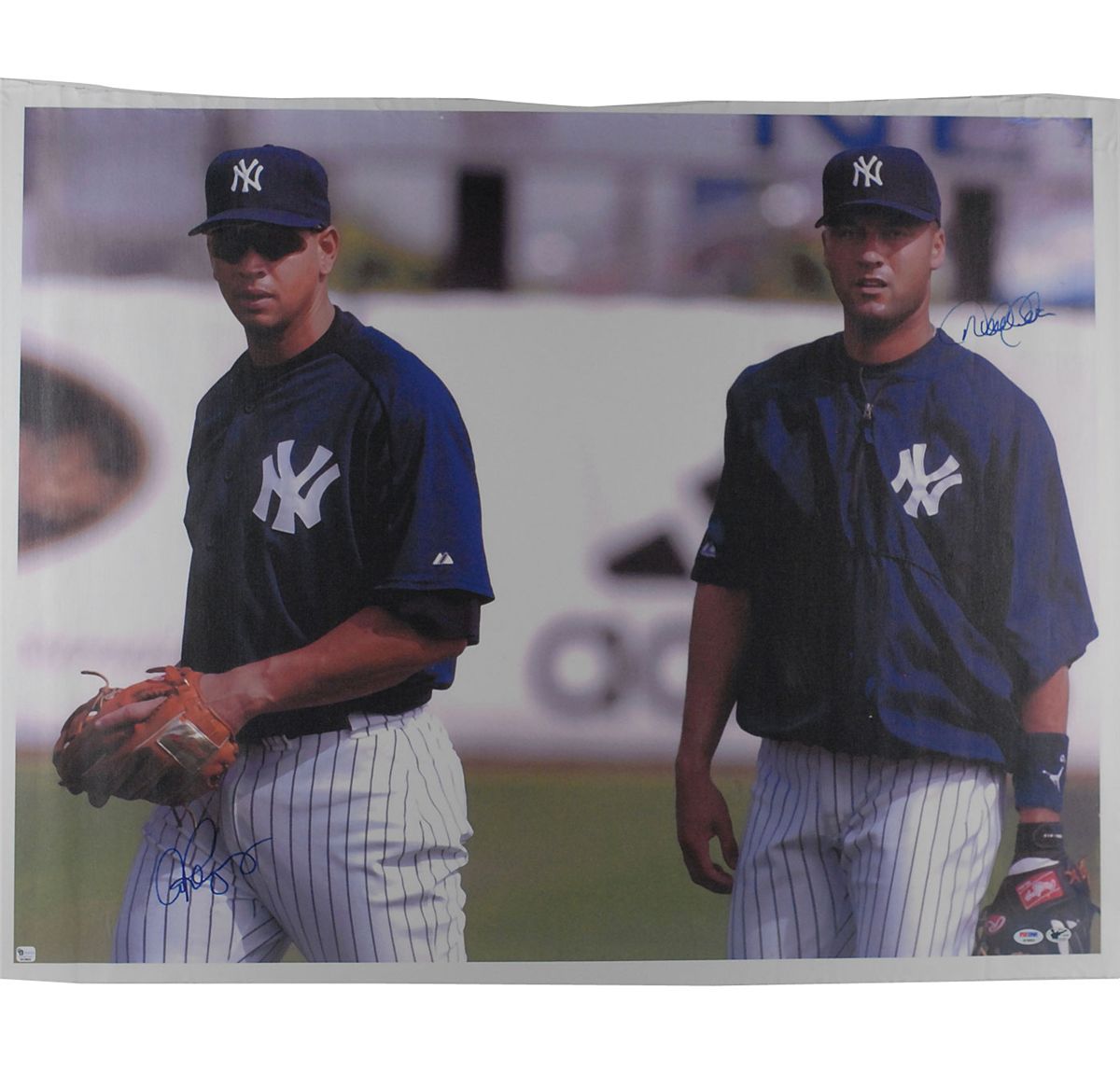 Impressive color 38 x 29.75 print on canvas of a painting showing Jeter and Rodriguez warming up together before a game, nicely signed in blue felt tip by both. Rolled and in fine condition, with a PSA/DNA label affixed to the lower right (certificate of authenticity not present).