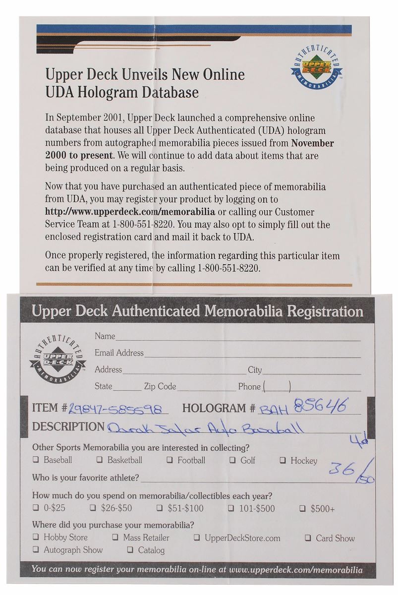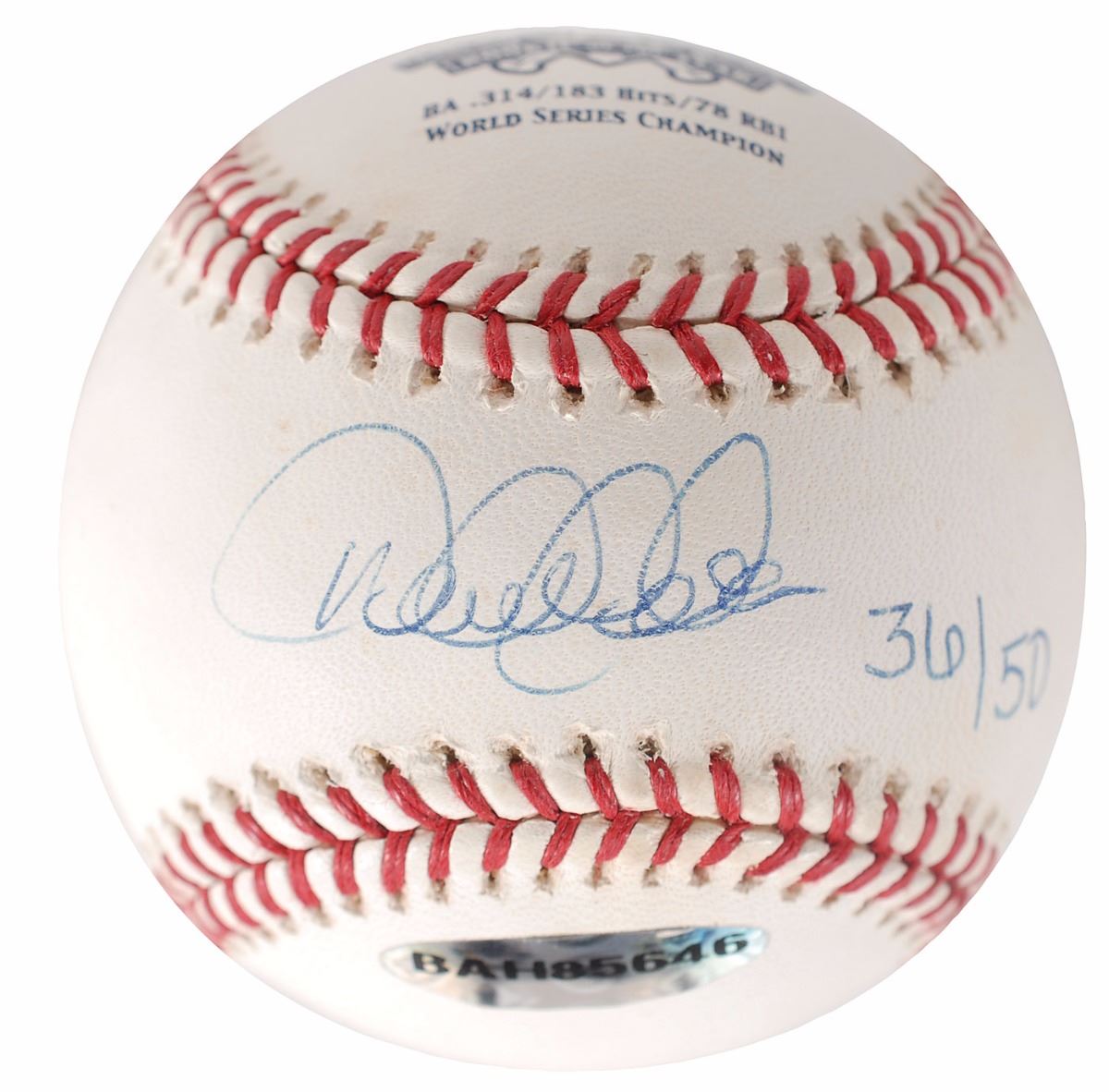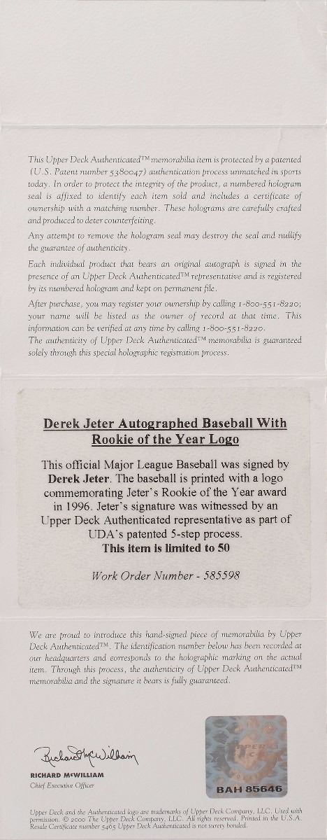 Limited edition official Rawlings Major League baseball honoring Jeter’s rookie season, numbered 36/50, signed in blue ballpoint on the sweet spot. In fine condition, with an Upper Deck authentication label affixed to the lower panel. Accompanied by a certificate of authenticity from Upper Deck, as well as the original box and bag.