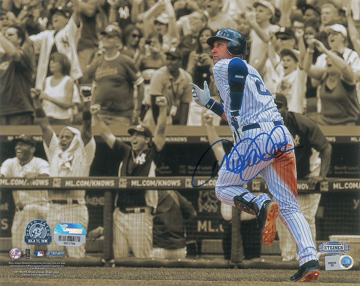 Color satin-finish 10 x 8 full-length photo of Derek Jeter looking into the outfield as he begins to round the bases at Yankee Stadium, signed in blue felt tip. In very fine condition, with authenticity labels affixed to lower corners. Accompanied by a certificate of authenticity from Steiner Sports.