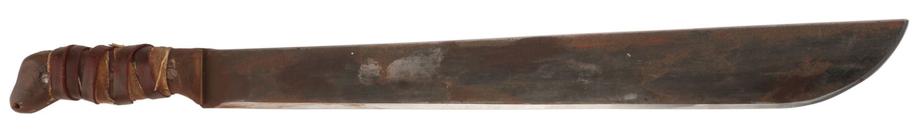 413. Derek Mears "Jason Voorhees" hero machete prop from Friday the 13th. (Platinum Dunes, 2009) Original hero machete prop constructed of tooled aluminum blade, which has been beveled to appear razor sharp (but is actually blunt) and distressed to appear aged and oxidized. The short handle is composed of a two-piece wooden grip that sandwiches the end of the metal blade and is dressed with fabric and leather cord and distressed to appear grisly and well "used". The entire prop measures 32.5 x 3.25 in. In fine condition. Originally from Platinum Dunes productions. $3,000 - $5,000