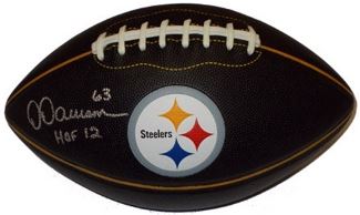 Dermontti Dawson was named to seven straight Pro Bowls from 1992 to 1998 and was a six-time AP First Team All-Pro. In 1993, he was named co-AFC Offensive Lineman of the Year by the NFLPA and in 1996 he was named the NFL Alumni’s Offensive Lineman of the Year. He played in 170 consecutive games, the second most in Steelers history. He was elected to the Pro Football Hall of Fame in 2012. Dermontti Dawson has hand signed this Pittsburgh Steelers black logo football and has added the inscription, "HOF 12." MAB Hologram and Certificate of Authenticity from Athlon Sports.