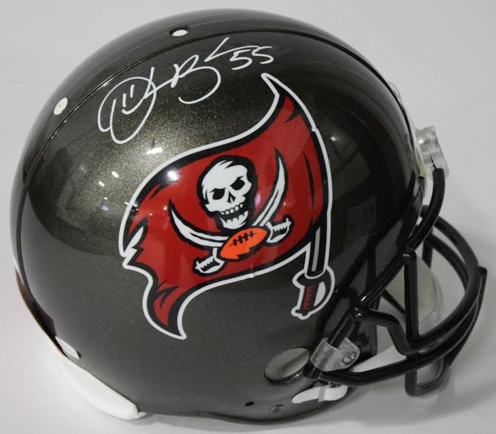 Tampa Bay Buccaneers full-size authentic on-field helmet. Hand-signed in white paint pen by Derrick Brooks (HOF).