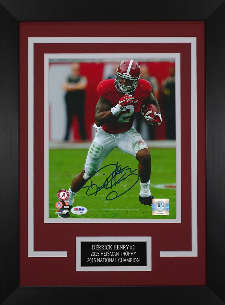 A beautifully Framed Autographed Derrick Henry Alabama Crimson Tide Photo. The Autographed Photo is certified by PSA and includes a sticker on the Photo and a matching certificate attached to the back of the frame.