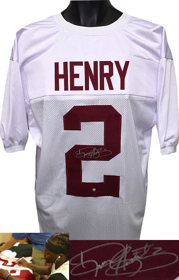 Derrick Henry was destined for college stardom after his 12,124 career rushing yards and 153 career touchdowns in high school alone. Taking over as the lead back in the Crimson Tide backfield in 2015, Henry broke out in a huge way, running for 2,219 yards and 28 touchdowns, leading Alabama to the 2016 CFP National Championship. With his sights set on the NFL, Henry has declared for the 2016 NFL Draft and was drafted by the Tennessee Titans in the 2nd Round. This is a Derrick Henry Alabama Crimson Tide signed White unlicensed custom-prostyle jersey with twill stitched nameplate and numbers #2. Photo of the Signing, Steiner Sports Hologram and Certificate of Authenticity. Size XL