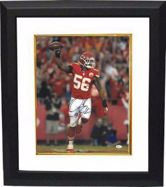 Derrick Johnson was drafted 15th overall by the Kansas City Chiefs. Johnson started every game for the Kansas City Chiefs in 2005, becoming the first Chiefs linebacker in 20 years to start all 16 games of his rookie campaign. He was subsequently awarded the Mack Lee Hill Award by the Chiefs (presented to the most outstanding rookie). In Week 17 of the 2009 NFL season, Johnson had an NFL-record tying two interceptions returned for touchdowns. Derrick Johnson has hand autographed this Kansas City Chiefs 16x20 Photo. JSA Hologram and Certificate of Authenticity. Custom White Mat and Premium Black Color Framed as shown.