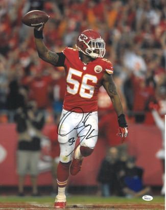 Derrick Johnson was drafted 15th overall by the Kansas City Chiefs. Johnson started every game for the Kansas City Chiefs in 2005, becoming the first Chiefs linebacker in 20 years to start all 16 games of his rookie campaign. He was subsequently awarded the Mack Lee Hill Award by the Chiefs (presented to the most outstanding rookie). In Week 17 of the 2009 NFL season, Johnson had an NFL-record tying two interceptions returned for touchdowns. Derrick Johnson has hand autographed this Kansas City Chiefs 16x20 Photo. JSA Hologram and Certificate of Authenticity.