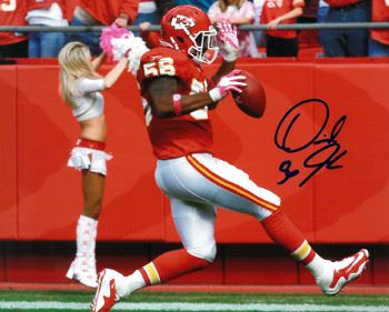 Derrick Johnson was drafted 15th overall by the Kansas City Chiefs. Johnson started every game for the Kansas City Chiefs in 2005, becoming the first Chiefs linebacker in 20 years to start all 16 games of his rookie campaign. He was subsequently awarded the Mack Lee Hill Award by the Chiefs (presented to the most outstanding rookie). In Week 17 of the 2009 NFL season, Johnson had an NFL-record tying two interceptions returned for touchdowns. Derrick Johnson has hand autographed this Kansas City Chiefs 8x10 Photo. Certificate of Authenticity from Athlon Sports.