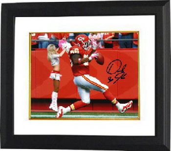 Derrick Johnson was drafted 15th overall by the Kansas City Chiefs. Johnson started every game for the Kansas City Chiefs in 2005, becoming the first Chiefs linebacker in 20 years to start all 16 games of his rookie campaign. He was subsequently awarded the Mack Lee Hill Award by the Chiefs (presented to the most outstanding rookie). In Week 17 of the 2009 NFL season, Johnson had an NFL-record tying two interceptions returned for touchdowns. Derrick Johnson has hand autographed this Kansas City Chiefs 8x10 Photo. Certificate of Authenticity from Athlon Sports. Custom White Mat and Premium Black Frame as shown.