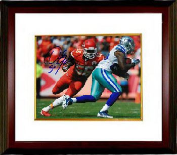 Derrick Johnson was drafted 15th overall by the Kansas City Chiefs. Johnson started every game for the Kansas City Chiefs in 2005, becoming the first Chiefs linebacker in 20 years to start all 16 games of his rookie campaign. He was subsequently awarded the Mack Lee Hill Award by the Chiefs (presented to the most outstanding rookie). In Week 17 of the 2009 NFL season, Johnson had an NFL-record tying two interceptions returned for touchdowns. Derrick Johnson has hand autographed this Kansas City Chiefs 8x10 Photo. Certificate of Authenticity from Athlon Sports. Custom White Mat and Premium Mahogany Frame as shown.