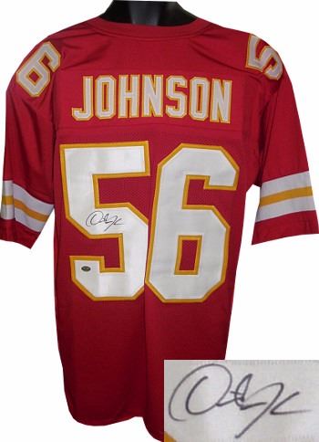 Derrick Johnson was drafted 15th overall by the Kansas City Chiefs. Johnson started every game for the Kansas City Chiefs in 2005, becoming the first Chiefs linebacker in 20 years to start all 16 games of his rookie campaign. He was subsequently awarded the Mack Lee Hill Award by the Chiefs (presented to the most outstanding rookie). In Week 17 of the 2009 NFL season, Johnson had an NFL-record tying two interceptions returned for touchdowns. Derrick Johnson Kansas City Chiefs has hand signed this Red unlicensed custom-prostyle jersey with twill stitched nameplate and numbers. Johnson Hologram and Certificate of Authenticity from Athlon Sports.