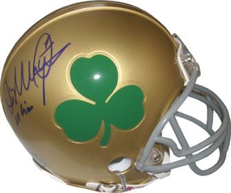 Derrick Mayes played college football at the University of Notre Dame from 1993 to 1996. He wore jersey number 1. He held the school record for career touchdown receptions until the record was broken by Jeff Samardzija. Derrick Mayes has hand signed this Notre Dame Fighting Irish Green Clover Logo Mini Helmet with All American inscription. MAB Hologram and Certificate of Authenticity from Athlon Sports.
