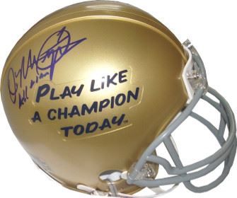 Derrick Mayes played college football at the University of Notre Dame from 1993 to 1996. He wore jersey number 1. He held the school record for career touchdown receptions until the record was broken by Jeff Samardzija. Derrick Mayes has hand signed this Notre Dame Fighting Irish Play Like a Champion Today Logo Mini Helmet with All American inscription. MAB Hologram and Certificate of Authenticity from Athlon Sports.