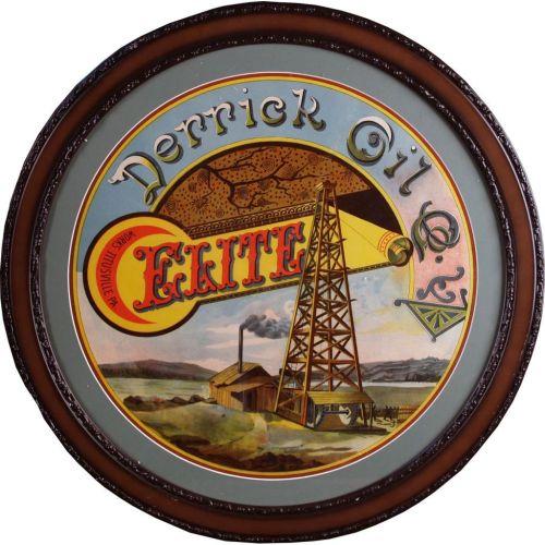 Derrick Oil Co., Round Barrel Label Circa 1870's Very Rare & Colorful