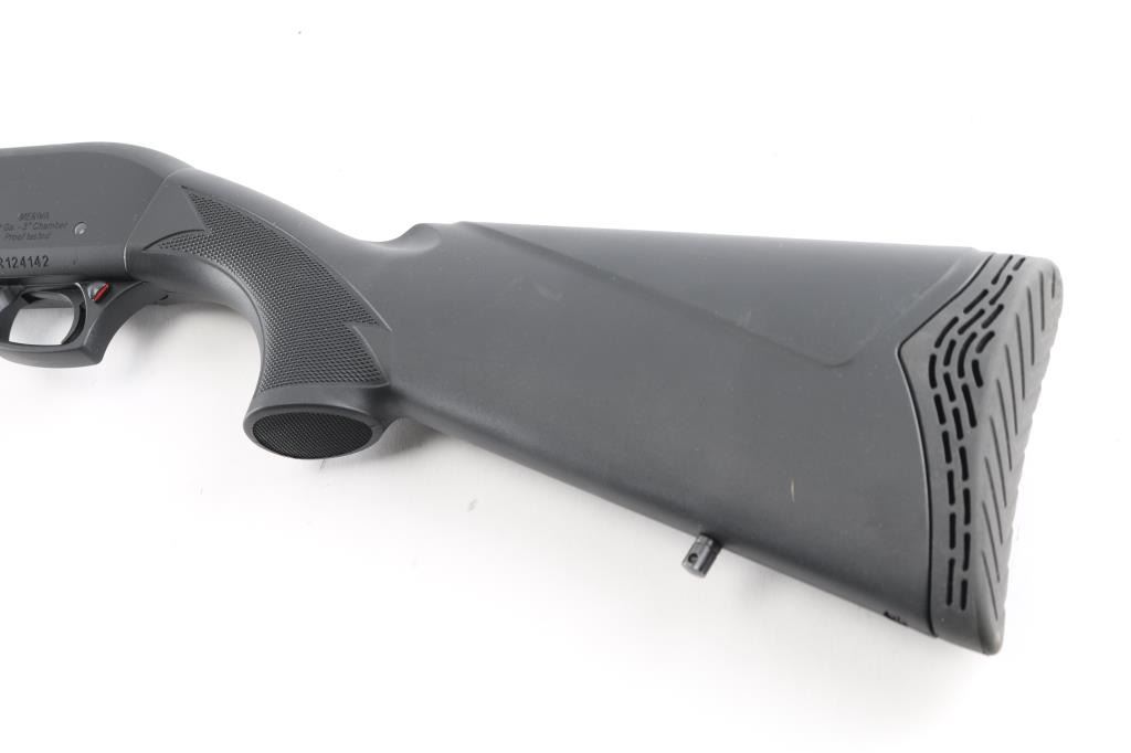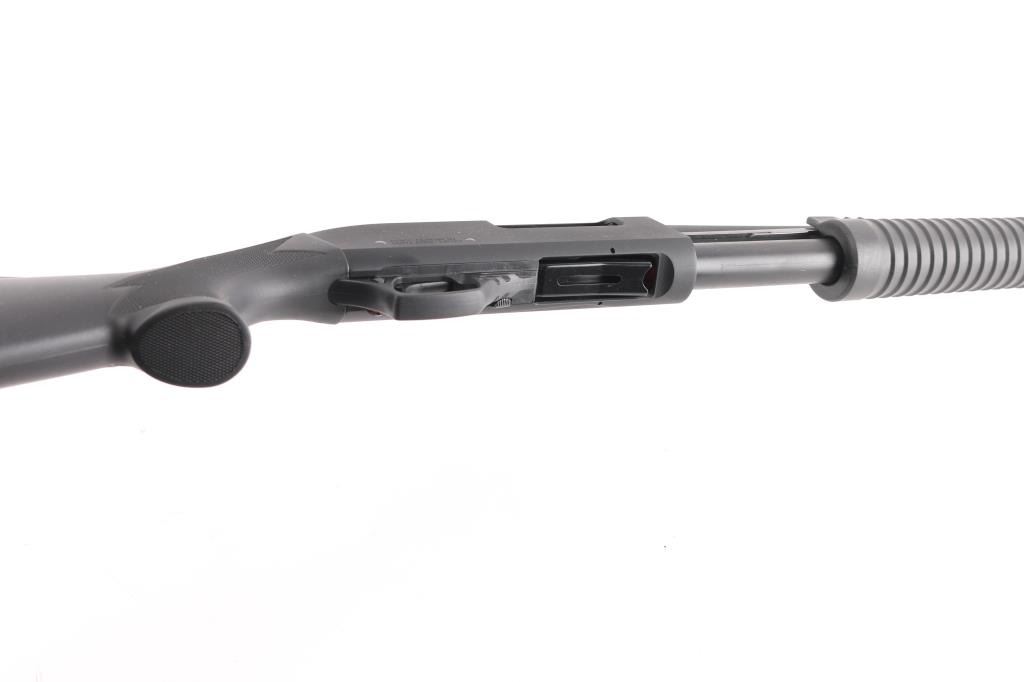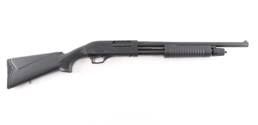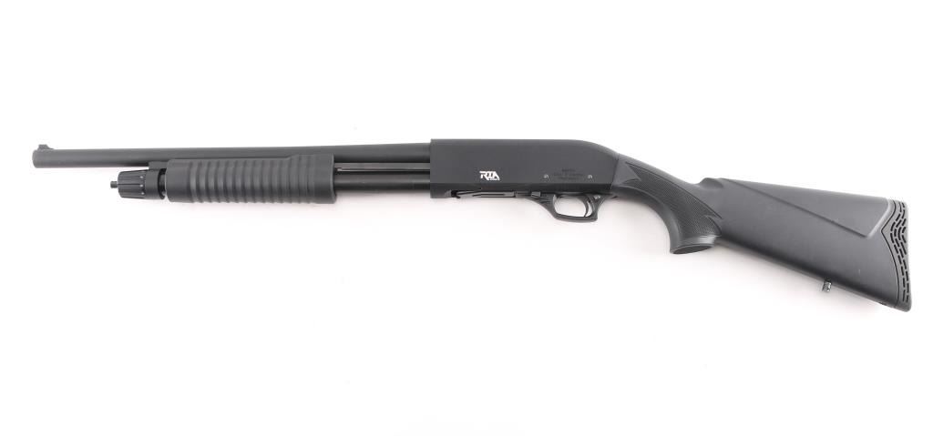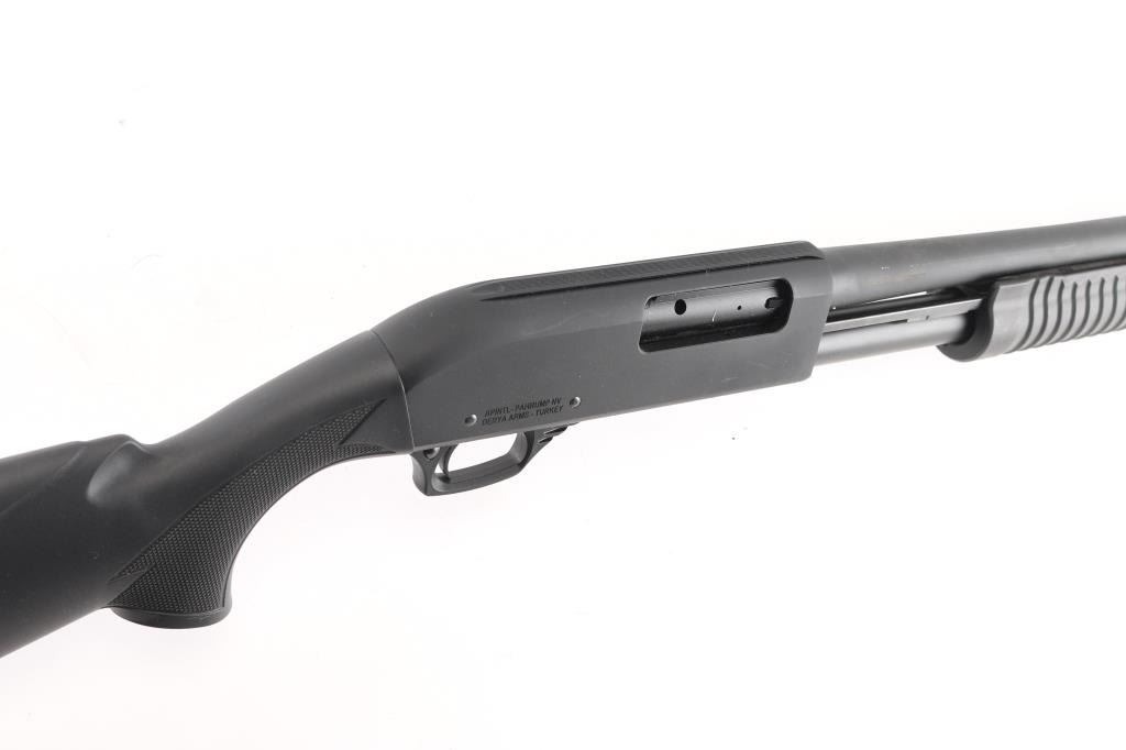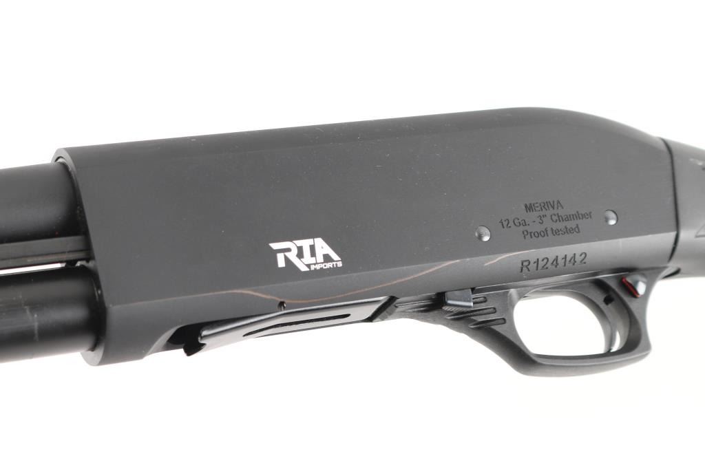 Made in Turkey, the Rock Island Armory/Armscor Meriva 12 gauge pump shotgun has a 3" chamber, 5 round tube magazine, an 18.5" Parkerized barrel with fixed blade front sight, and black synthetic stocks with rubber recoil pad and a LOP of 14". The matching receiver has integral grooves in the top for mounting scope bases. The stock has pressed checkering at the wrist and a "corn cob" style forend. Dual action bars. Fixed IC choke. Shotgun is like new, bore is excellent. The barrel has a couple of minor rubs.