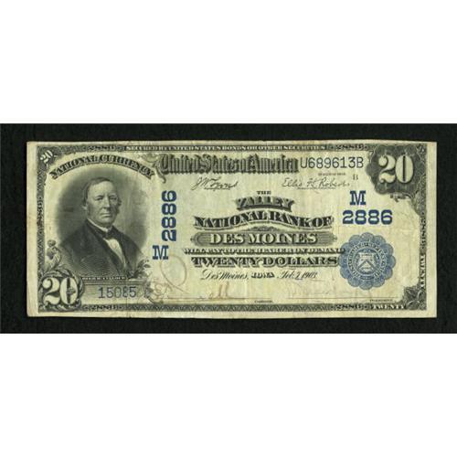 <B>Des Moines, IA</B></I> - $20 1902 Plain Back Fr. 650 <B>The Valley NB</B></I> Ch. # (M)2886<BR> A sound <B>Fine </B></I>with an appealing overall appearance.<BR><I>From The John Ameen Collection</B></I><BR><BR><b>Shipping:</b> Coins & Currency (<a target="_blank" href="http://www.heritageauctions.com/common/shipping.php">view shipping information</a>)
