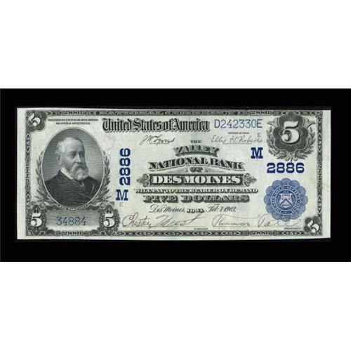 <B>Des Moines, IA</B></I> - $5 1902 Plain Back Fr. 598 <B>The Valley NB</B></I> Ch. # (M)2886<BR> A lone centerfold is noted on this attractive issue. The last AU example we handled sold for $747.50 at FUN last year. <B>Choice About Uncirculated.</B></I><BR><BR><b>Shipping:</b> Coins & Currency (<a target="_blank" href="http://www.heritageauctions.com/common/shipping.php">view shipping information</a>)
