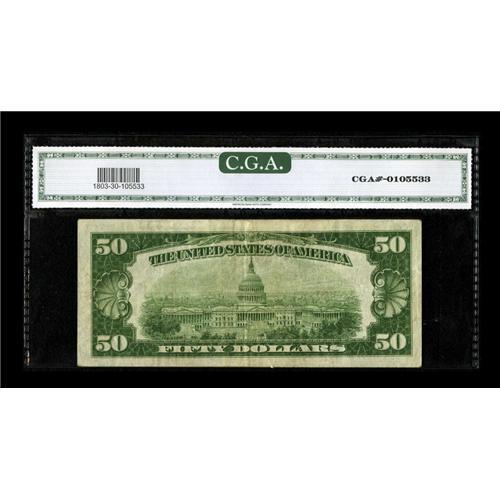 <B>Des Moines, IA</B></I> - $50 1929 Ty. 1 <B>Iowa-Des Moines NB & TC</B></I> Ch. # 2307<BR>Only 416 sheets of $50s were issued by this Midwest bank. This bright example is graded <B>Very Fine 30</B></I> by CGA. Just thirteen banks in Iowa issued this denomination.<BR><BR><b>Shipping:</b> Coins & Currency (<a target="_blank" href="http://www.heritageauctions.com/common/shipping.php">view shipping information</a>)