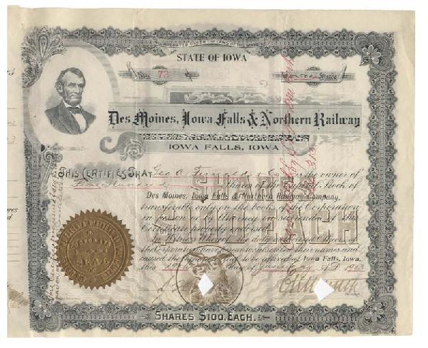 1903, Iowa. Stock certificate for 500 shares. Gray/black with gold seal. Vignette of bust of Abraham Lincoln at top left. Pen and punch cancelled. Very fine.