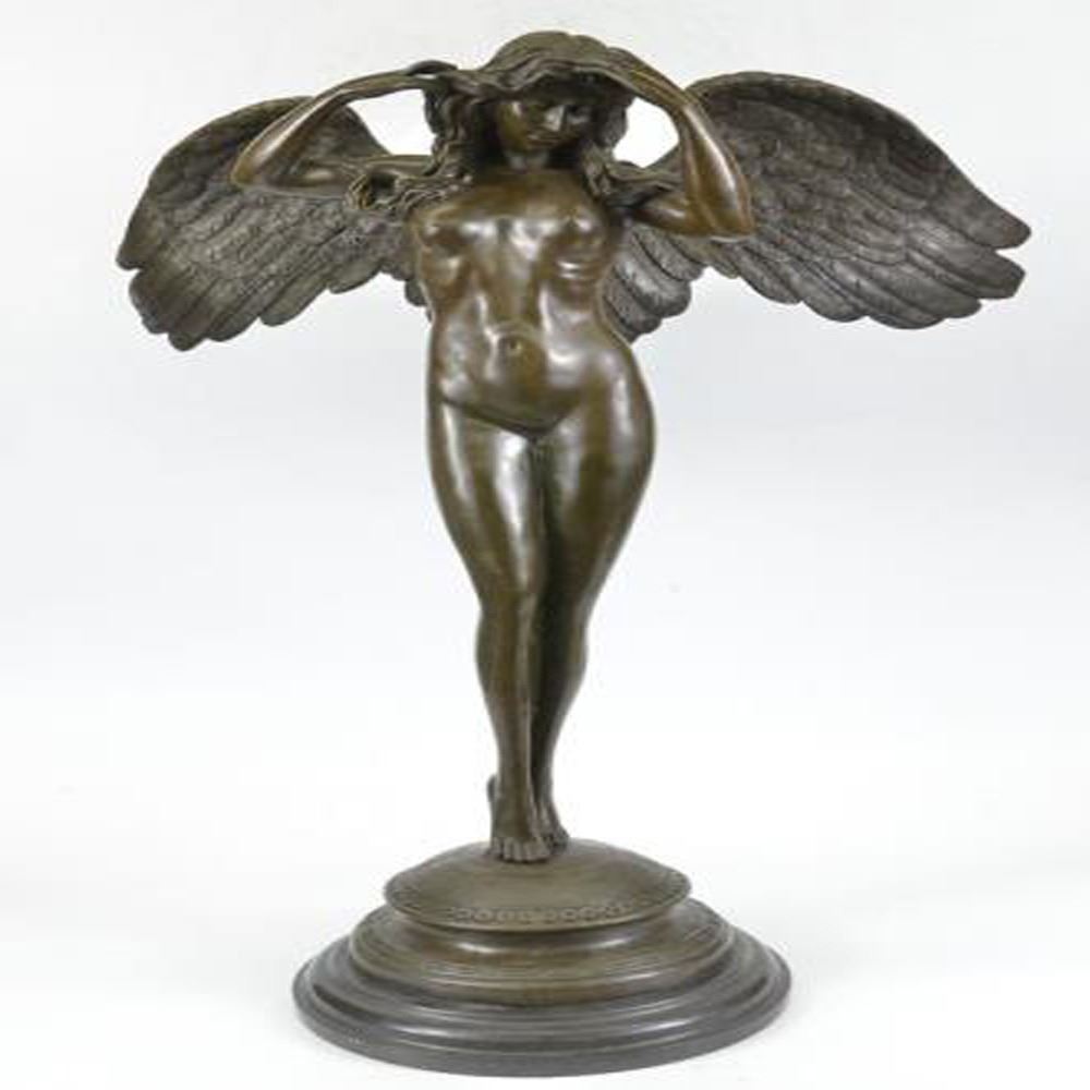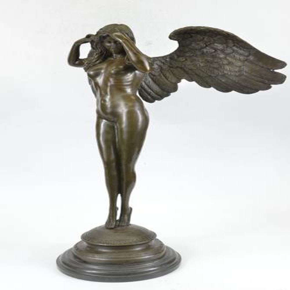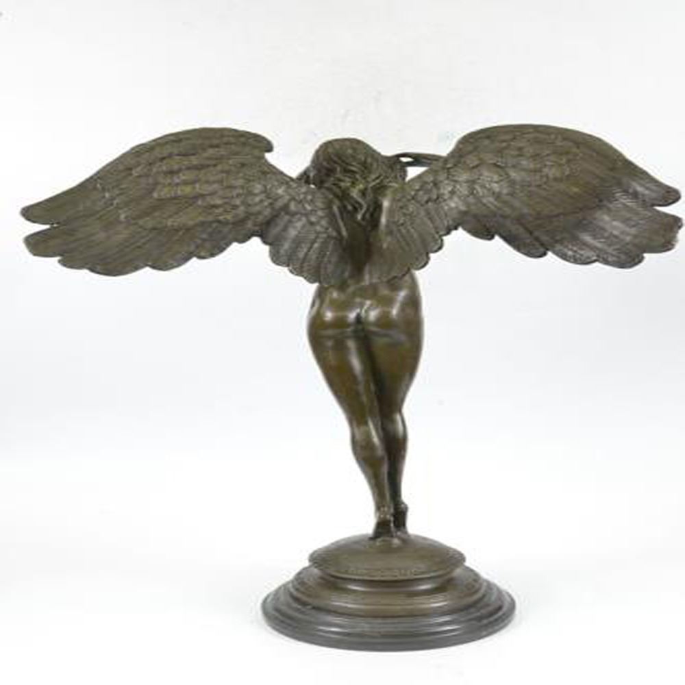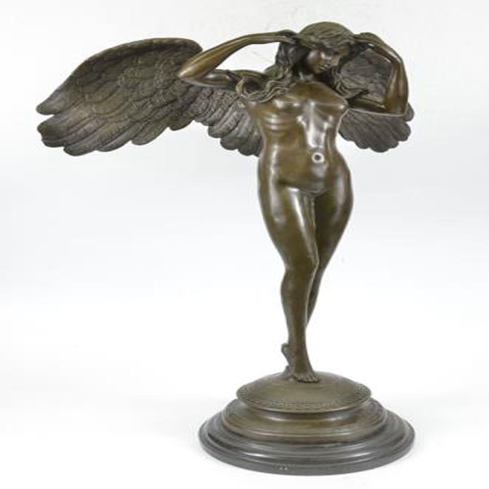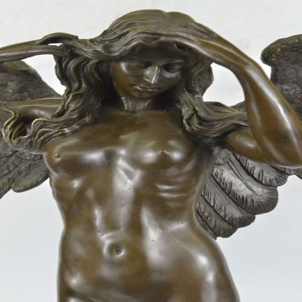 This Bronze Sculpture will go beautifully put in any room of the house or as a gift. The quality of this refined art is rarely found in re-casted Bronzes. This Sculpture was cast using the Lost Wax Method and is mounted on a marble base. It depicts a nude female angel with her head downcast, her arms softly brushing her hair, which cascades flowingly down her back. Her extended large wings are crafted with exquisite detail. Dimensions: Height 24 X Width 20 inches. Weight: 40 LBS.